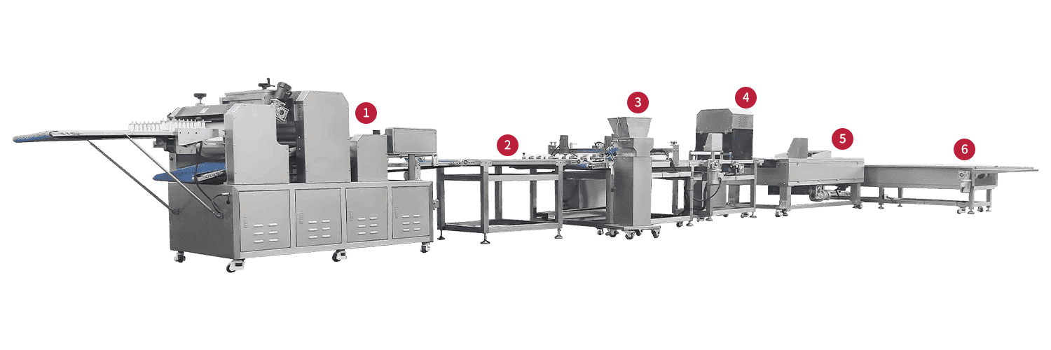 প্রোডাকশন লাইনটি এসটি -868-600 প্যাস্ট্রি রুটি ফর্মিং মেশিন, ফোর-চ্যানেল শান্টিং মেশিন, চার-চ্যানেল আটা রোলিং মেশিন, ফোর-চ্যানেল কনসেন্ট্রেটিং মেশিন, সিটি-কিউটি 450 ডাবল সার্ভো স্টিমড রুটি কাটিং টেবিল এবং সিটি-ডাব্লুপি 500 হরিজন্টাল প্লেট সাজানোর মেশিন (মডেল 500) দ্বারা গঠিত।